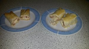 Egy kevés margarinon gyors megpirítjuk a bacon mindkét oldalát, azután félretesszük. A maradék margarinban( ha keveselljük, akkor mehet még hozzá), megpirítjuk az apróra vágott csirkemellet, ami mellé törünk egy fokhagymát. Ha megpirult, akkor hozzáöntjük a tejszínt, a reszelt sajtot, sózzuk, borsozzuk. 10 perc alatt összefőzzük. A rétestésztát kettészedtem, a felére ráfektettem a bacon, ráöntöttem a szaftos csirkét, és a baconös oldaláról kezdve feltekerjük. A tetejét megkenjük a tojással, és 15-20 perc alatt 180-200°C-on készre sütjük. A tészta miatt nem kívánt maga mellé köretet. De ha úgy látjuk jónak, akkor salátát készíthetünk mellé. Plusz szaftot sem kívánt, pedig azt hittem hiányolni fogom, de ha szeretnénk, akkor margarinnal, sajttal és tejszínnel készíthetünk még mellé sajtmártást.
